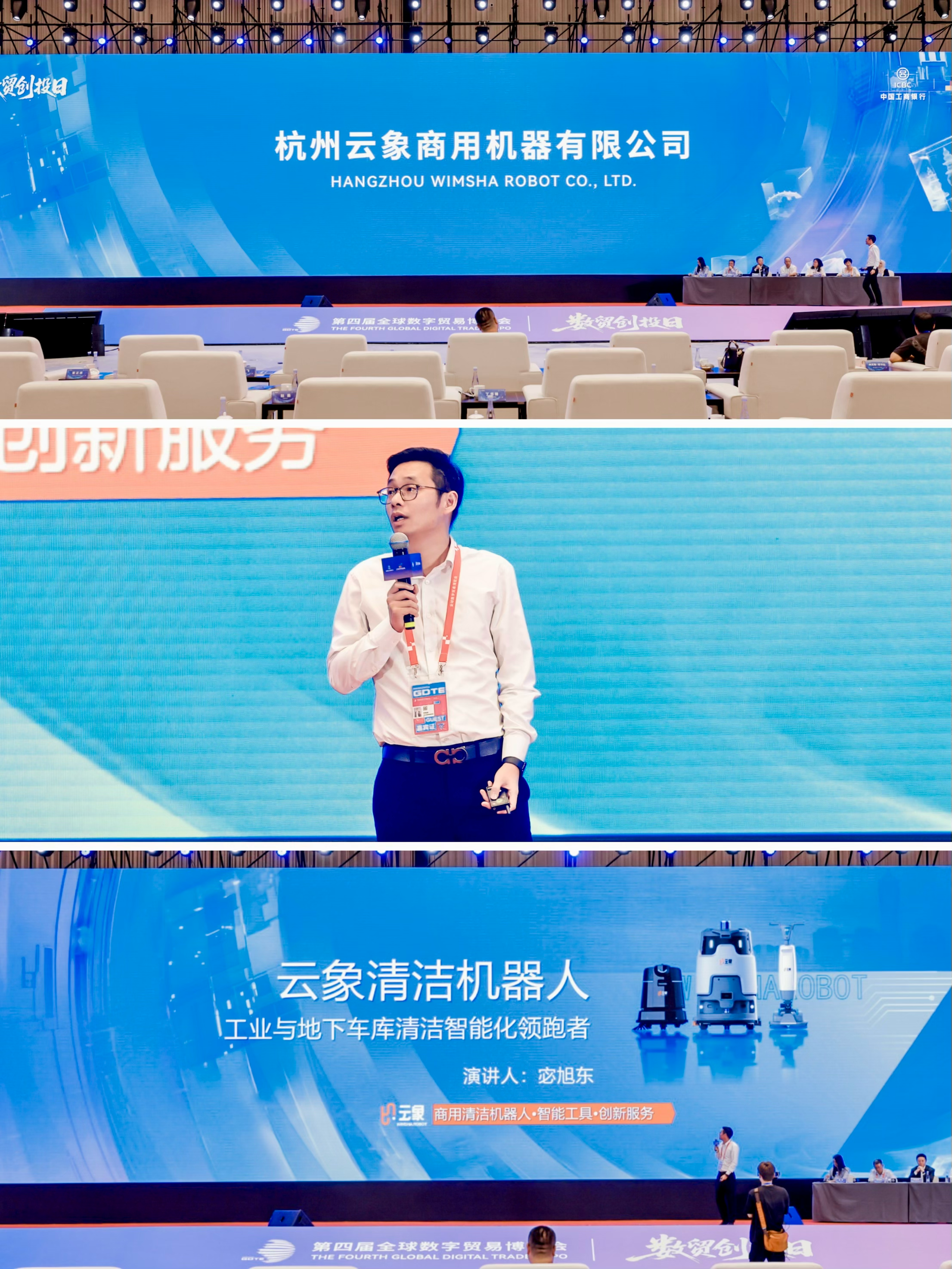 9月25日,第四届全球数字贸易博览会在杭州开幕,汇聚来自 154个国家/地区、1800+企业,重磅呈现“AI+数贸”成果。作为智能清洁机器人代表企业,云象机器人携 T3 Plus(优势场景-地下车库&工业)与 T1 登场,现场展示「清洁+协同」一体化智慧方案。