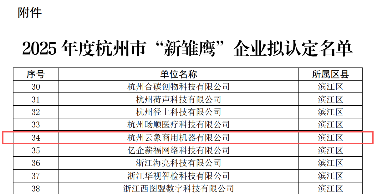 “新雏鹰”企业是杭州市面向未来产业、重点培育硬核科创力量的重要储备,聚焦强化企业科技创新主体地位,遴选具备核心技术与高成长潜力的前沿企业。此次入选,充分彰显了云象机器人在核心技术积累、产品能力与市场拓展方面的综合竞争力。